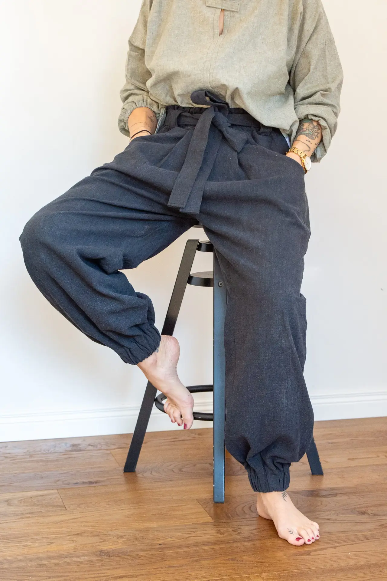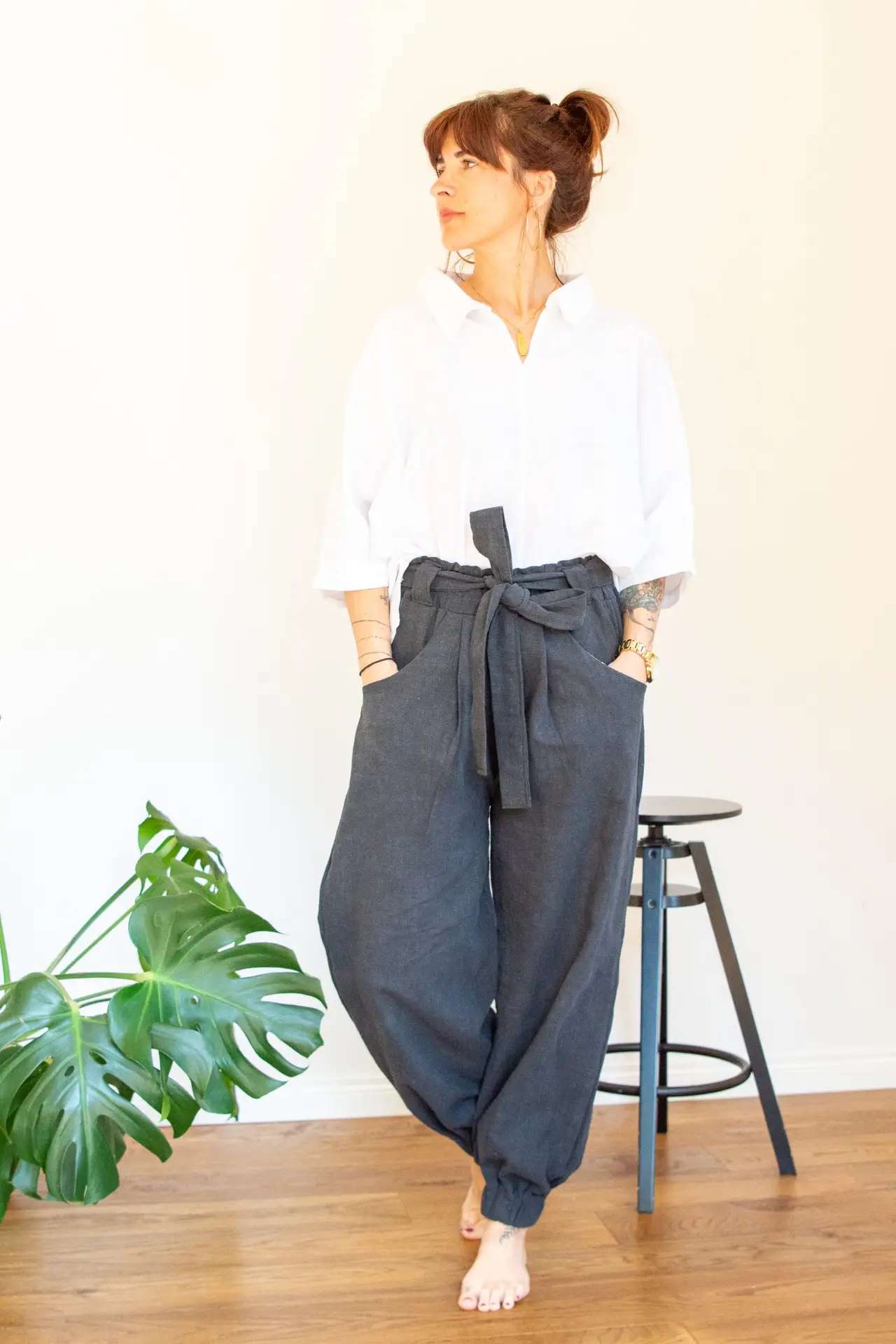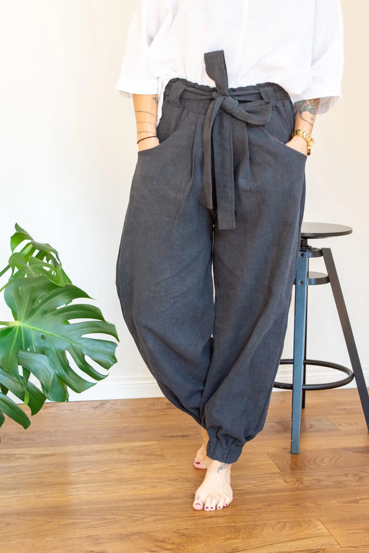A fabric belt wraps gently into a bow at the waist, while the ankles are softly gathered, creating a shape that feels both grounded and refined.